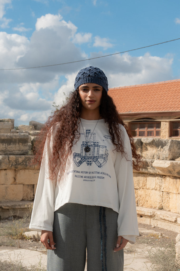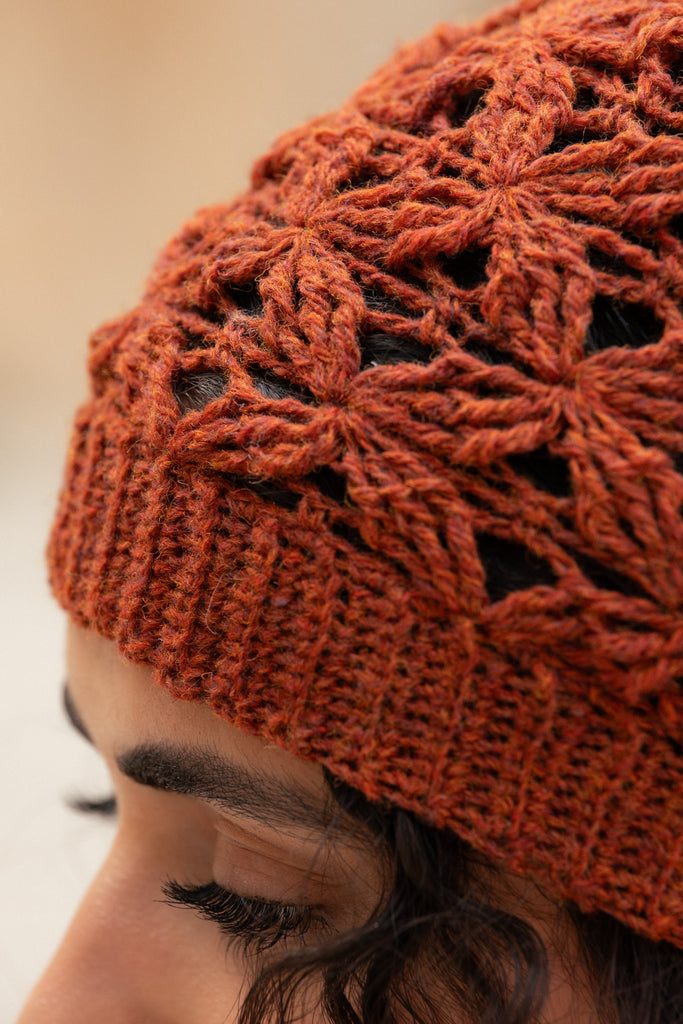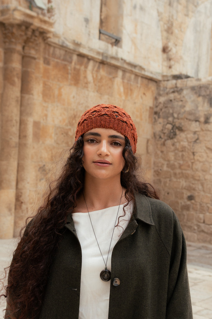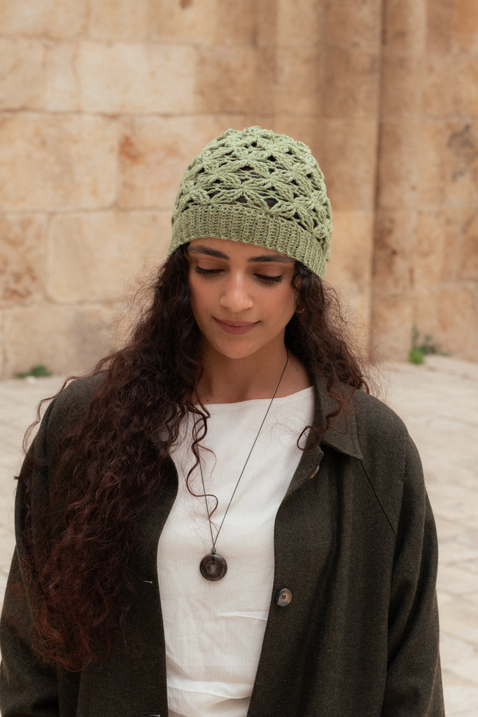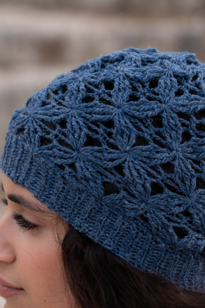 a crochet hat, hand-made by Ola on the outskirts of Jerusalem. made with organic shetland wool.