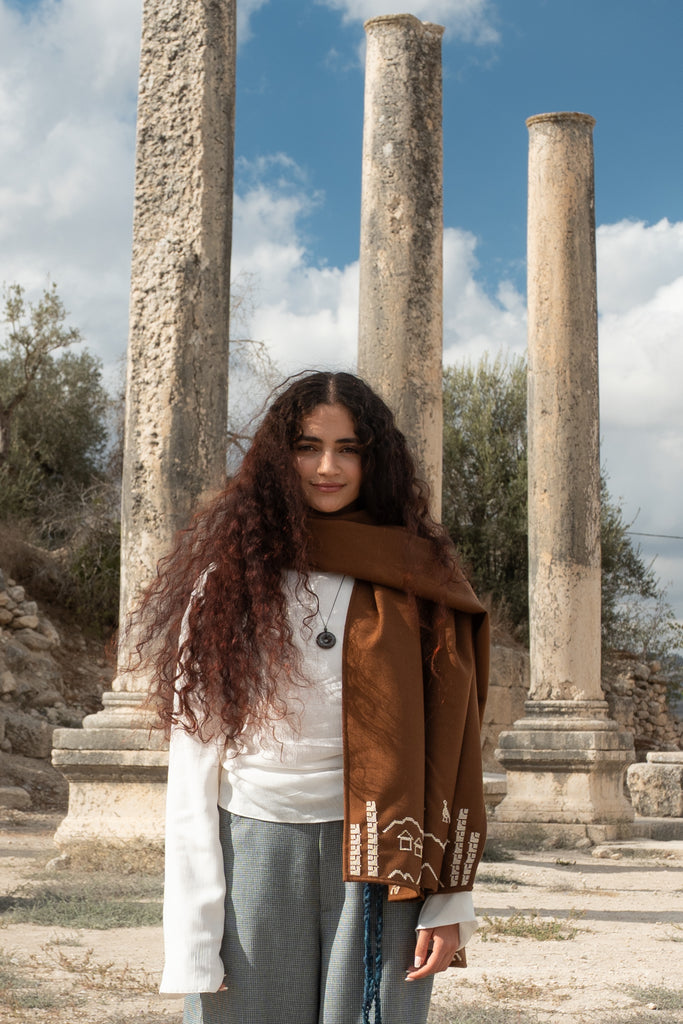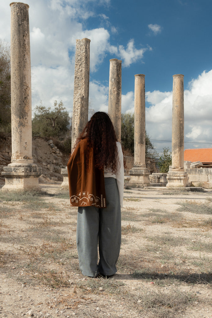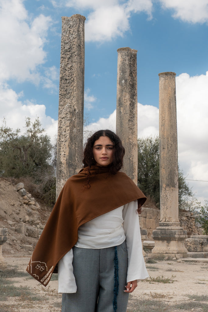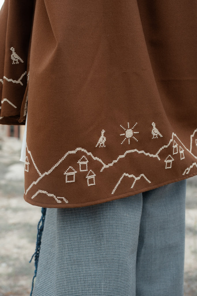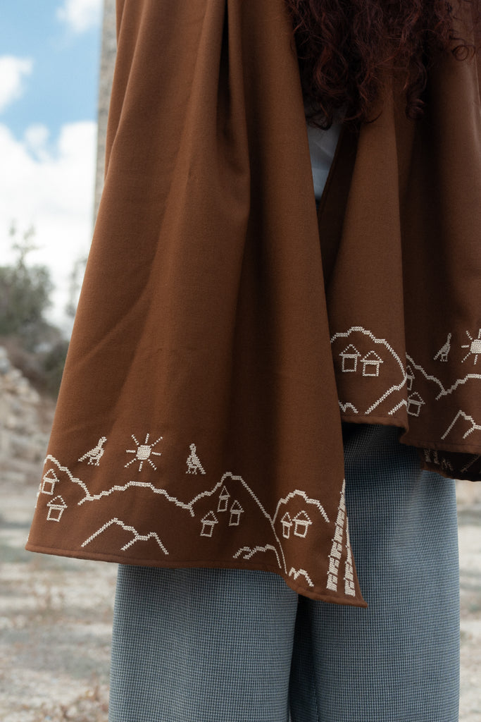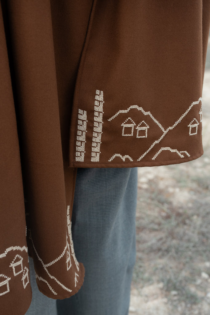The aisha is made with a 100% wool in chocolate brown and features a hand-embroidered landscape. Cut, sewn, and had-embroidered by Um Mousa and her team in Bethlehem.