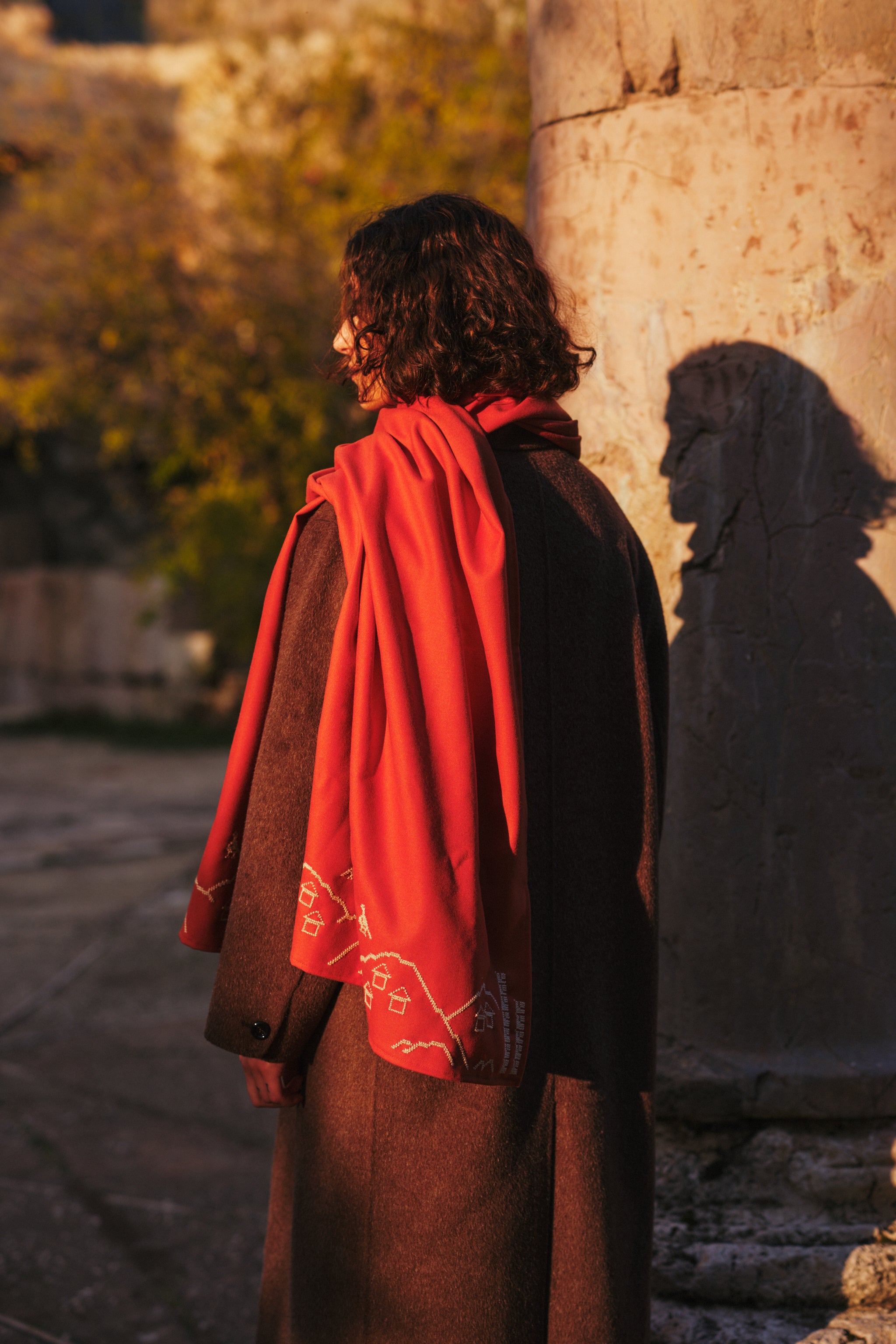 The aisha is made with a 100% wool in chocolate brown and features a hand-embroidered landscape. Cut, sewn, and hand-embroidered by Um Mousa and her team in Bethlehem.