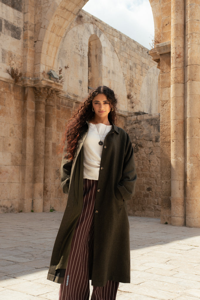 Inspired by the Arabic word “جنينة” (juneina), which evokes both “garden” and “paradise,” this piece carries echoes of a place once called the “city of gardens”—Jenin. Palestinian Tatreez embroidery is a centuries-old art form handmade by women in Palestine and traditionally passed down from mother to daughter.