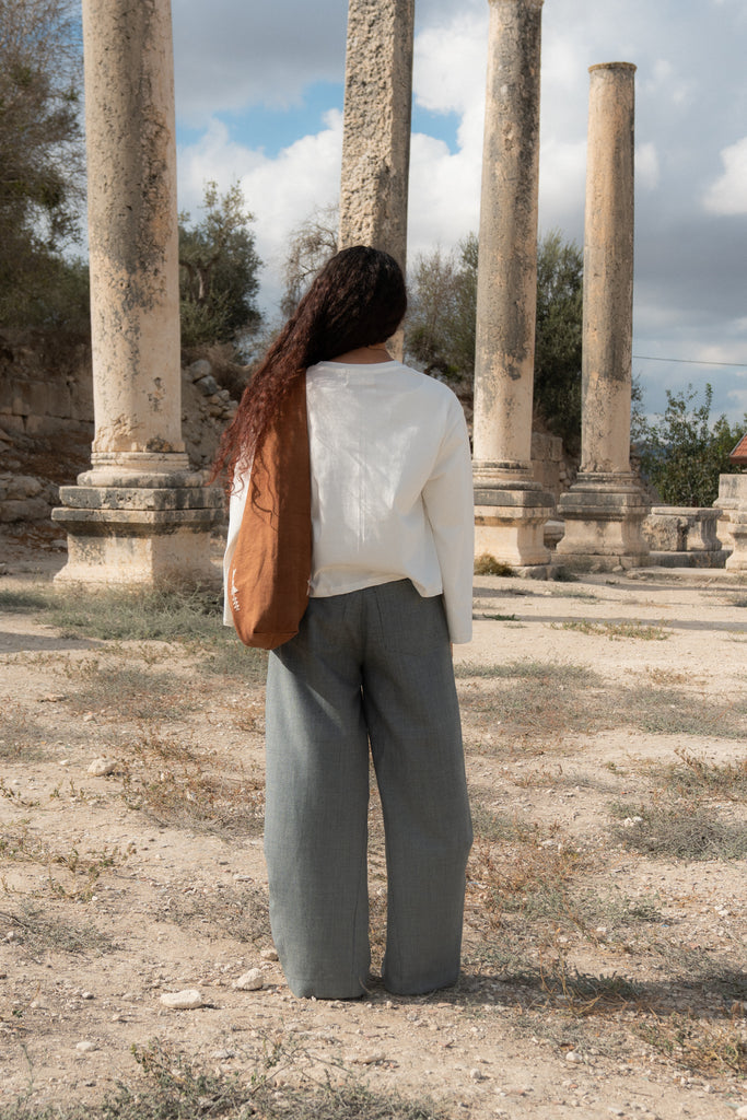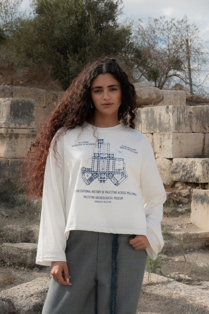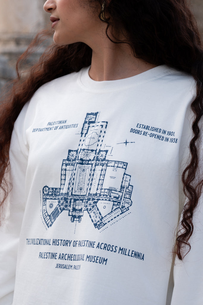 A relaxed, long-sleeved tee with a round neckline, featuring a screen-printed illustration of what was originally the Palestine Archeology museum in Jerusalem. The museum was seized during the Naksa and converted into the Rockefeller Archeological Museum, a symbol of erasure.