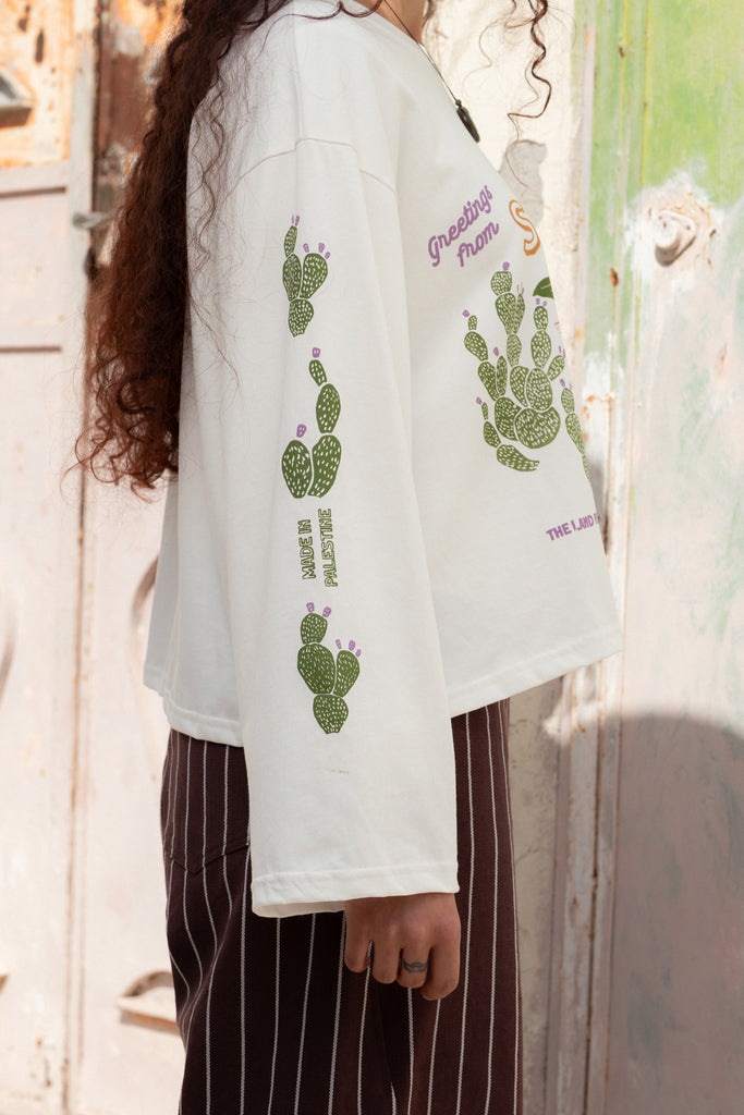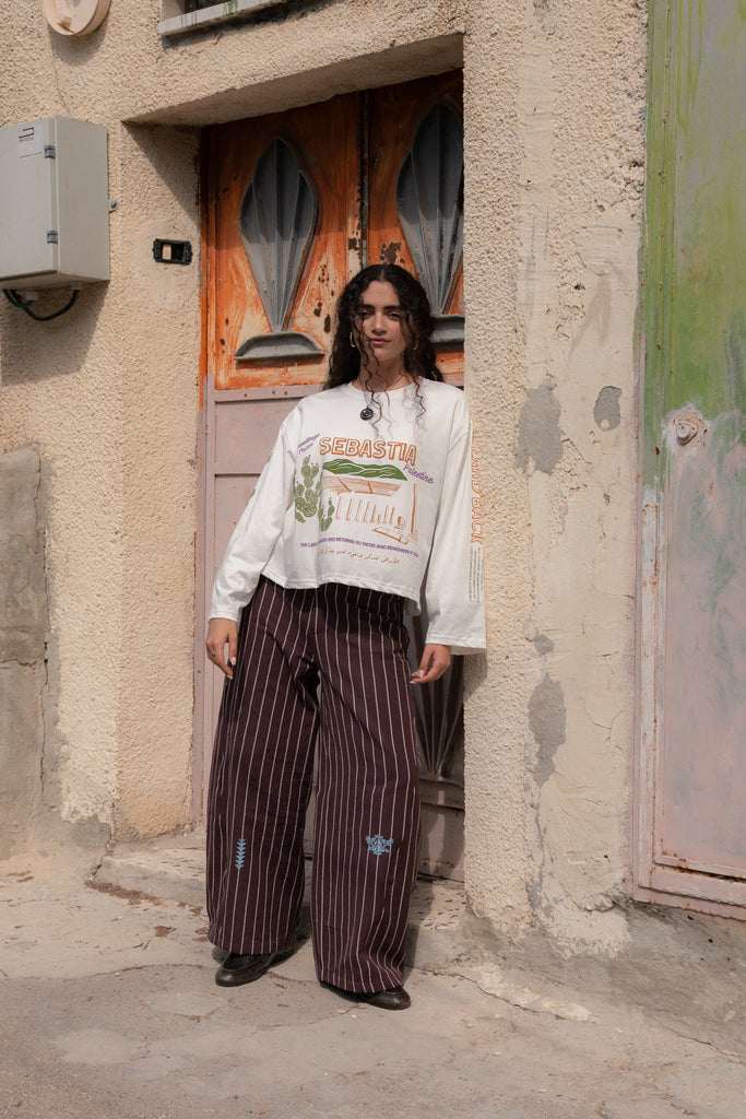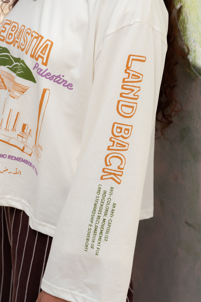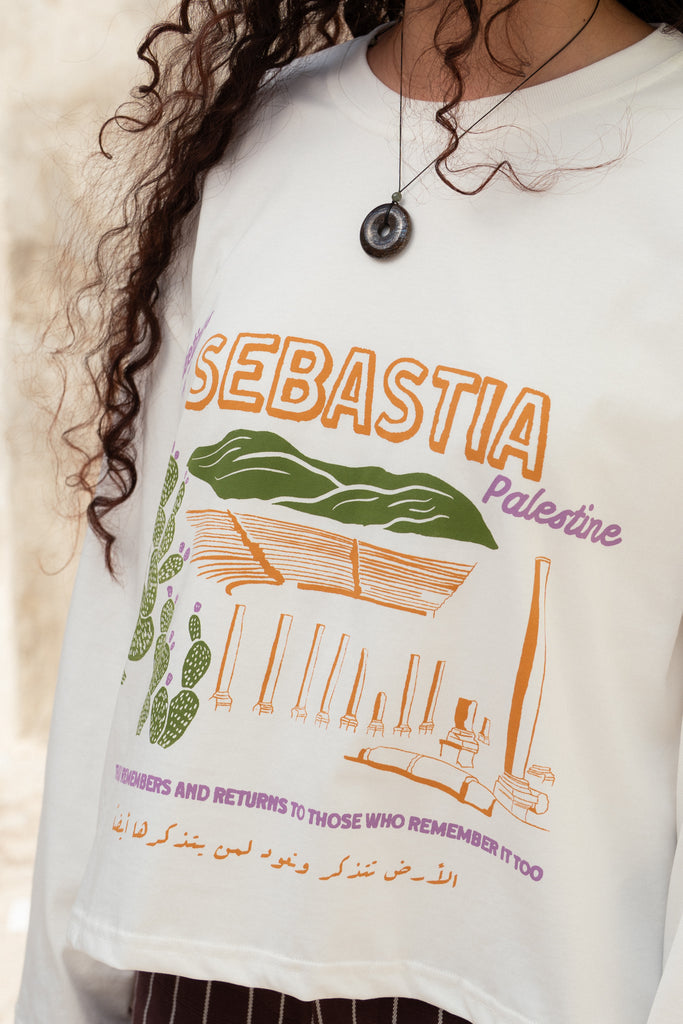 A relaxed, long-sleeved tee with a round neckline, featuring a screen-printed illustration of Sebastia—an ancient Palestinian heritage site under threat of seizure by occupation forces.