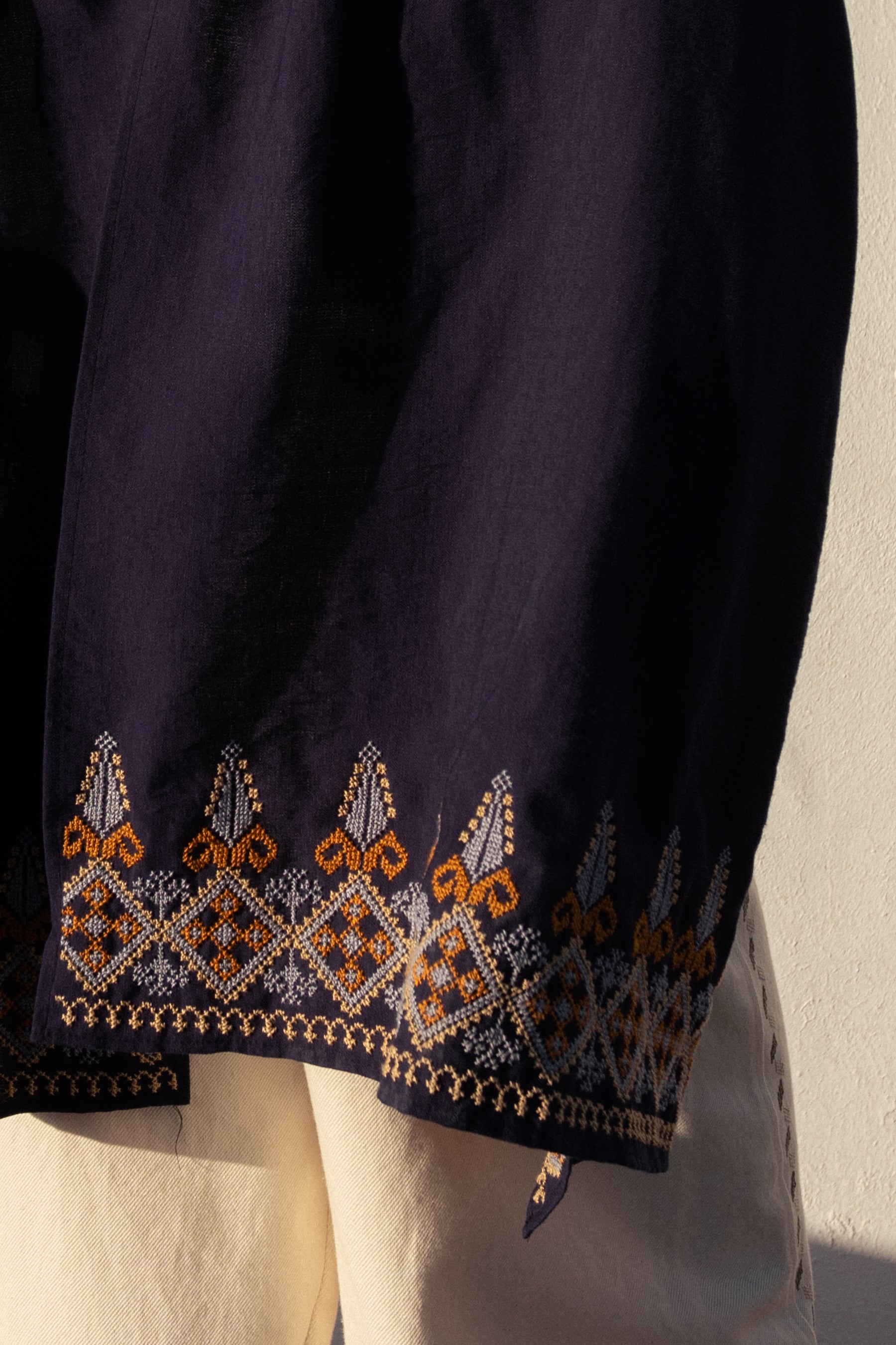 The Nadia is made with a linen in soft yellow and features hand-embroidery. Cut, sewn, and had-embroidered by Um Mousa and her team in Bethlehem.