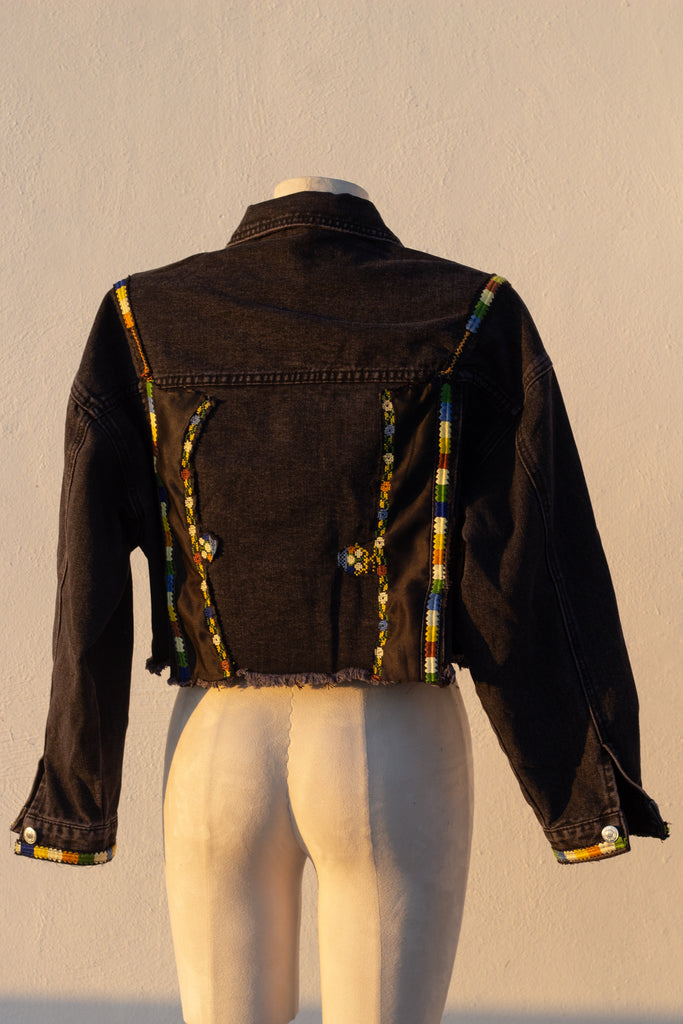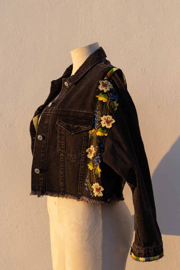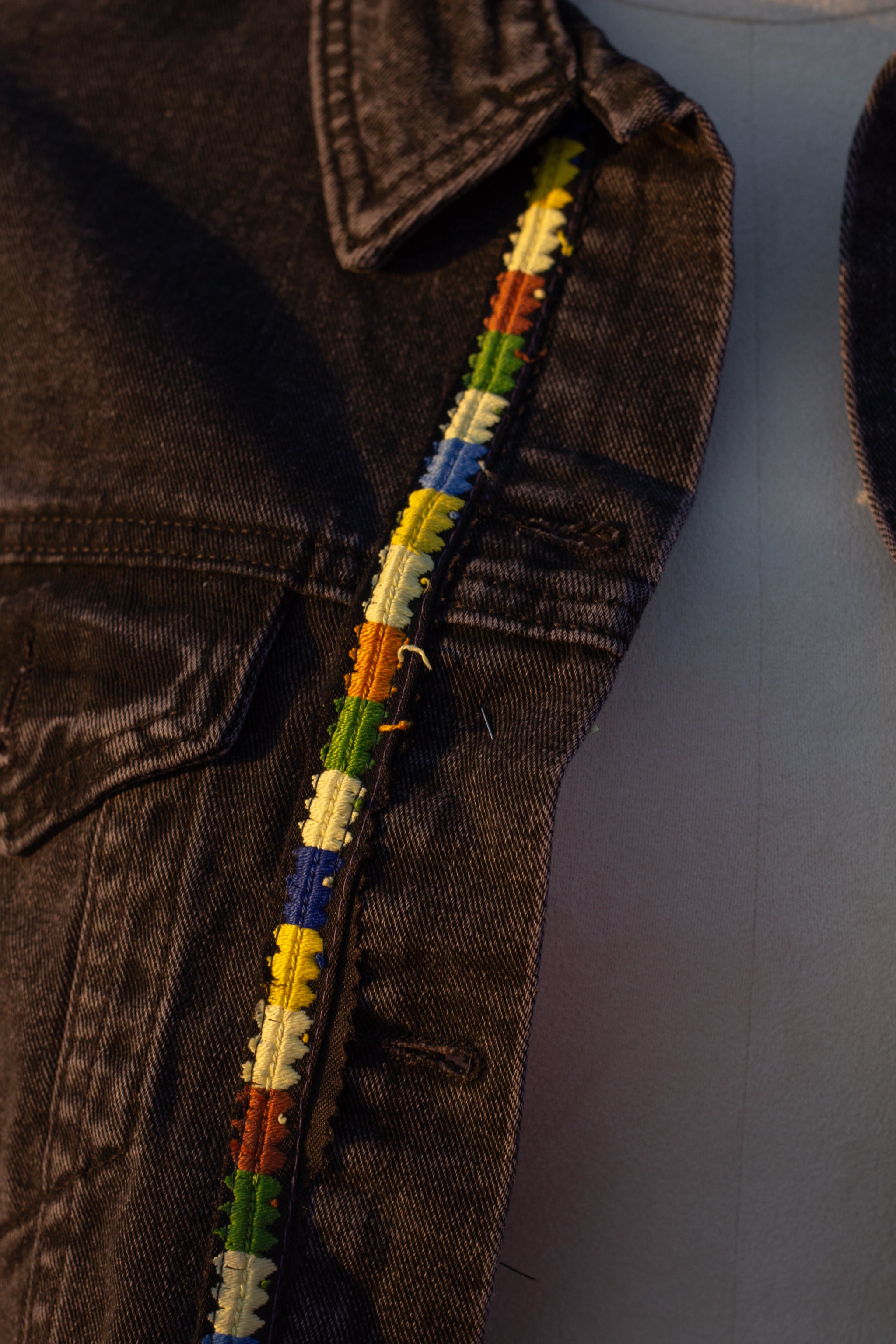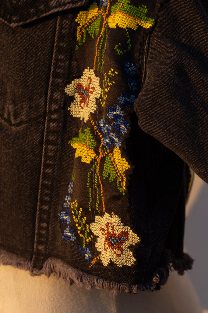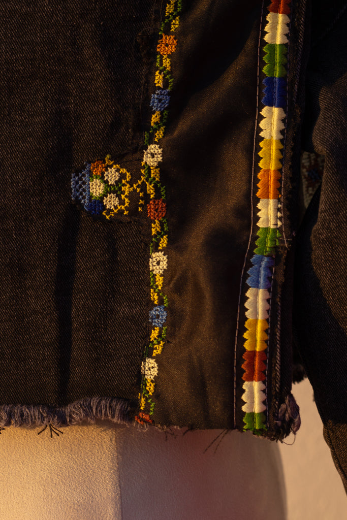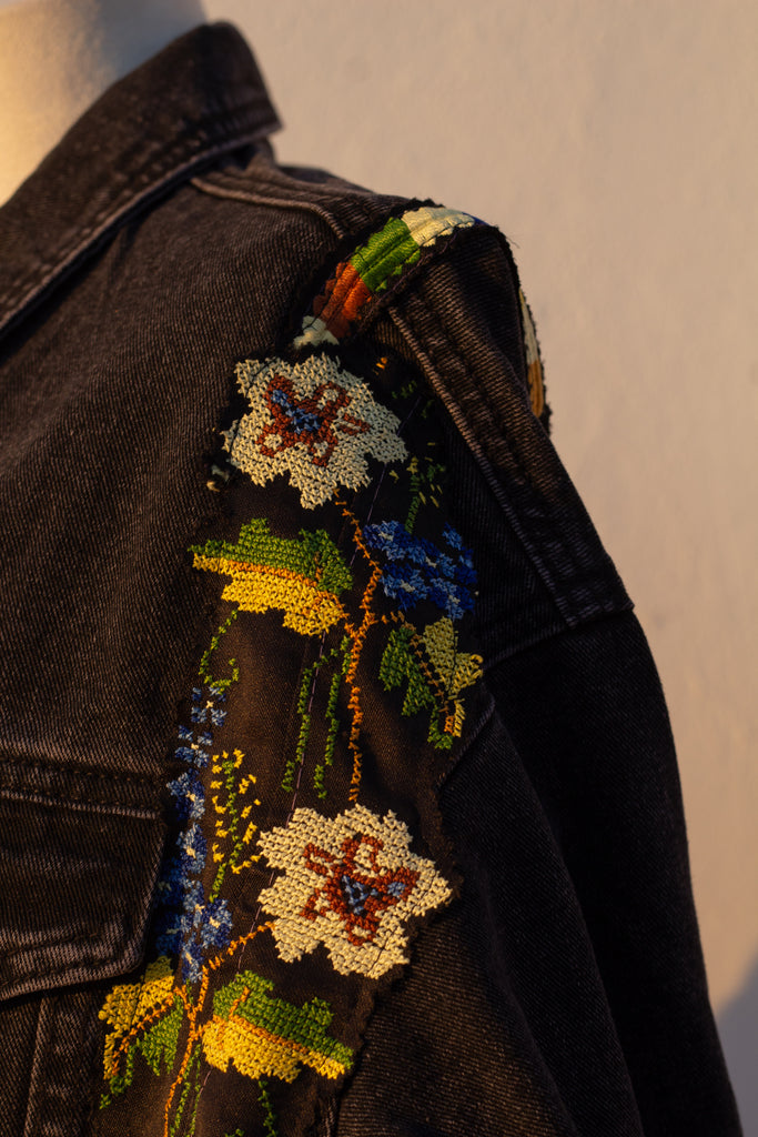 a denim jacket featuring up-cycled tatreez from a vintage Palestinian thob.