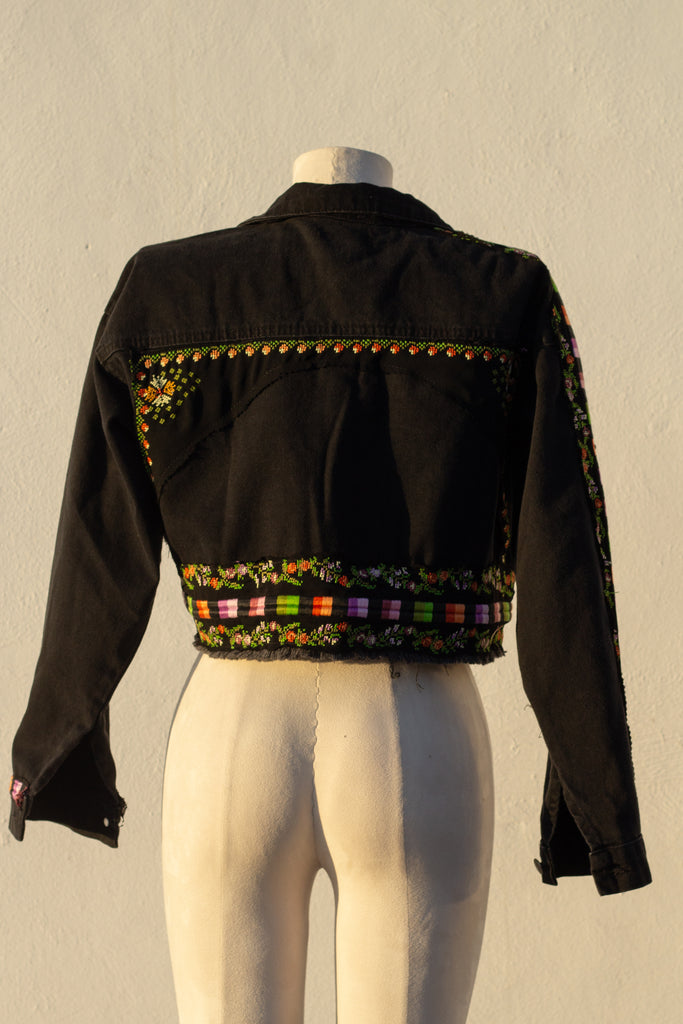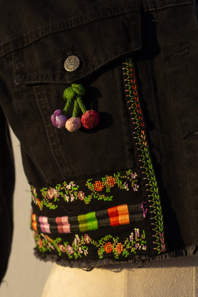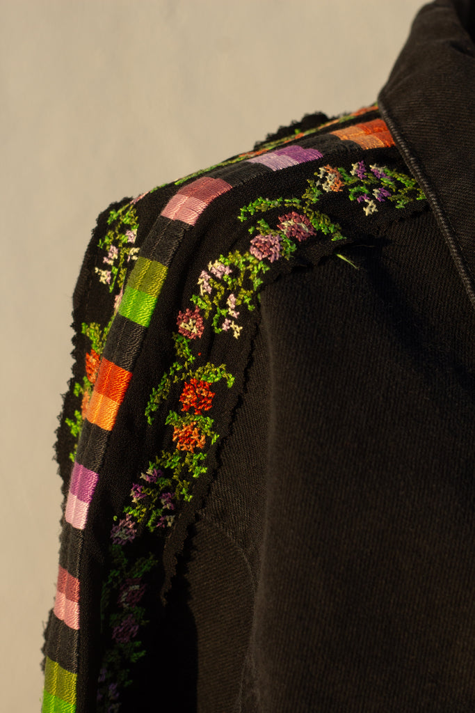 a denim jacket featuring up-cycled tatreez from a vintage Palestinian thob.
