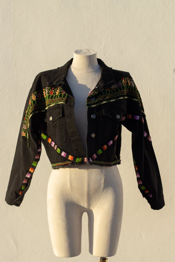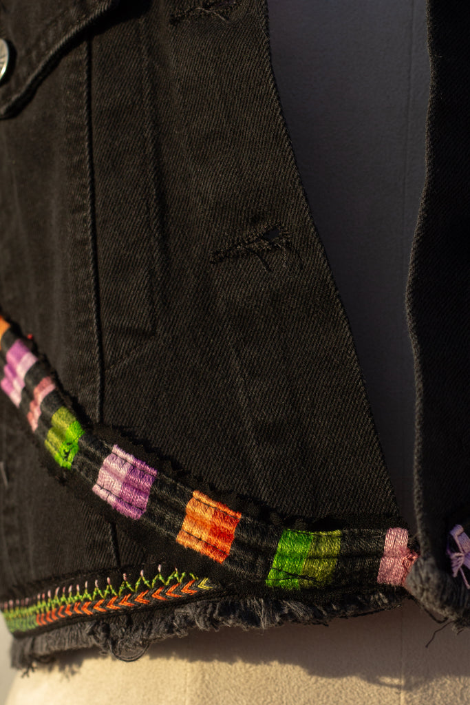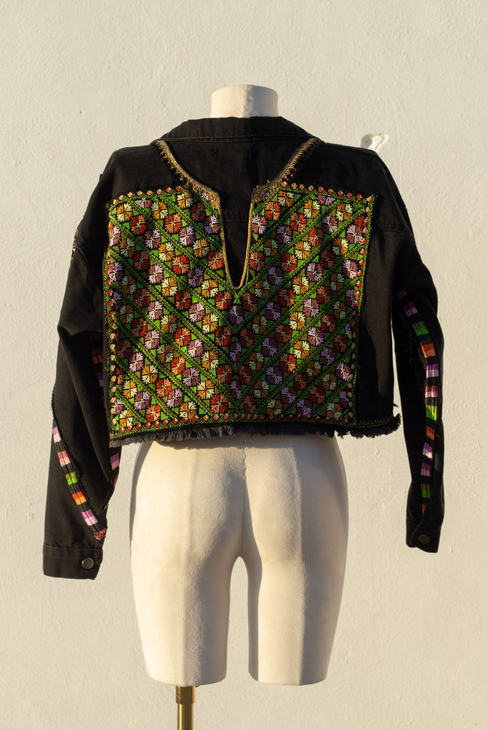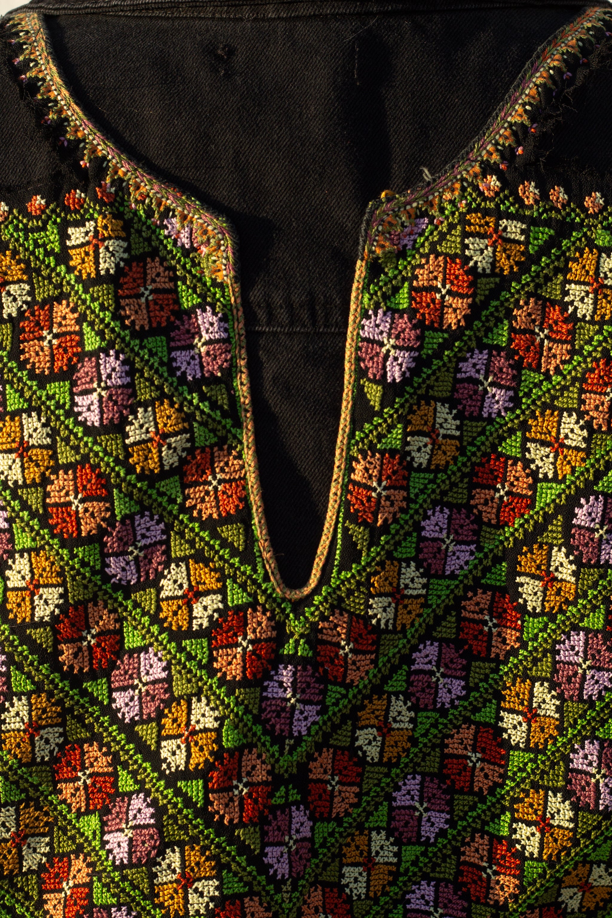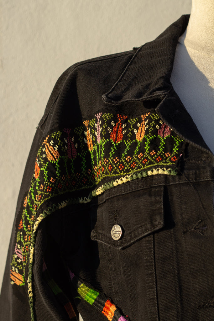 a denim jacket featuring up-cycled tatreez from a vintage Palestinian thob.