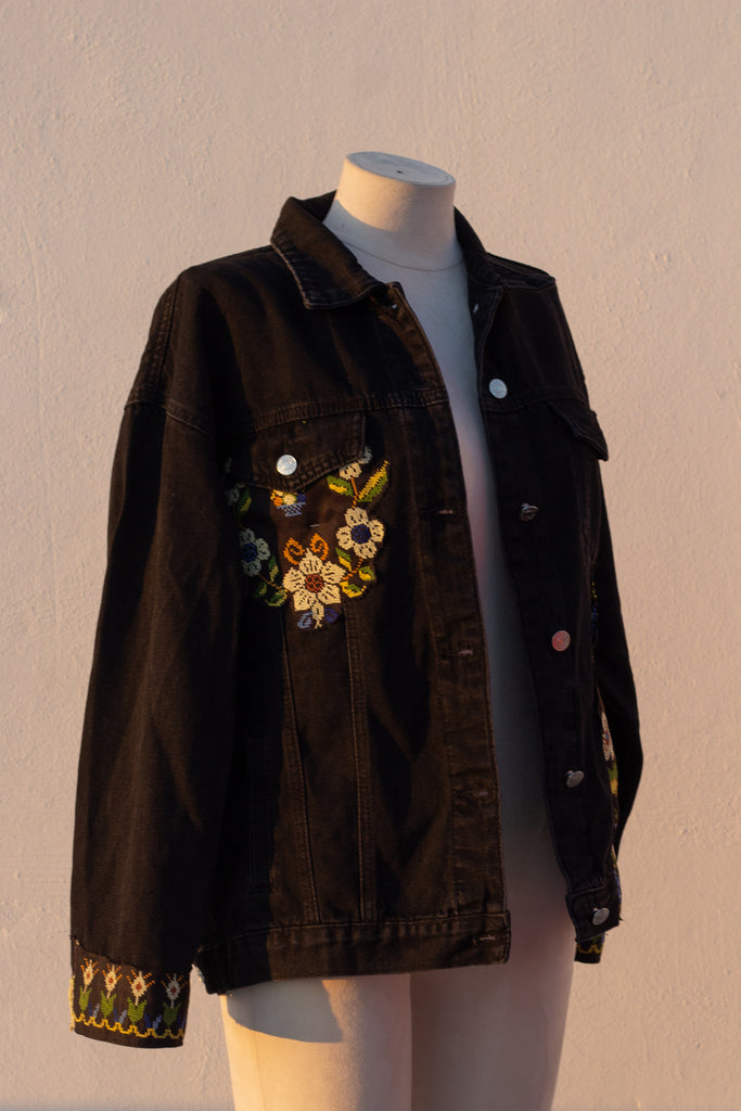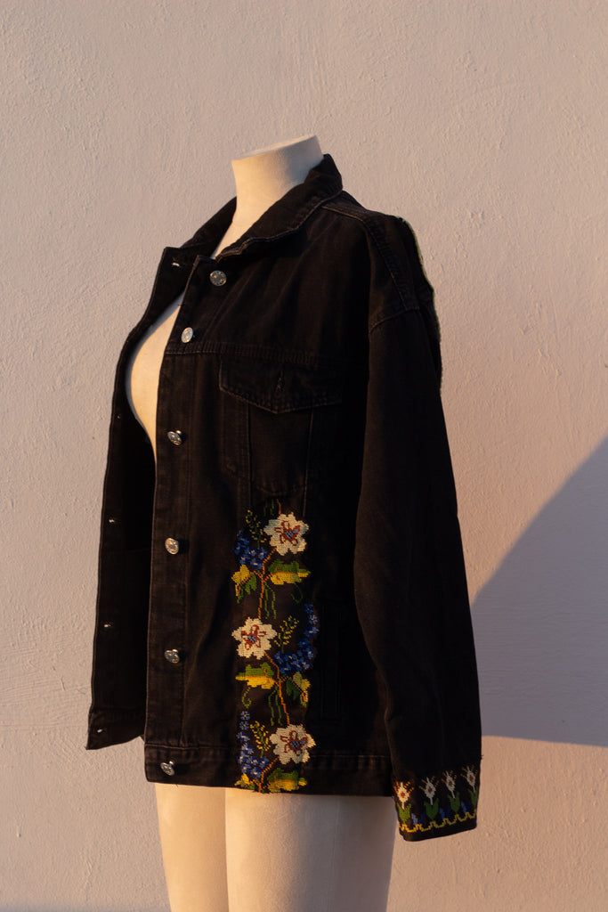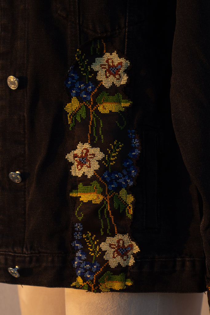 a denim jacket featuring up-cycled tatreez from a vintage Palestinian thob.