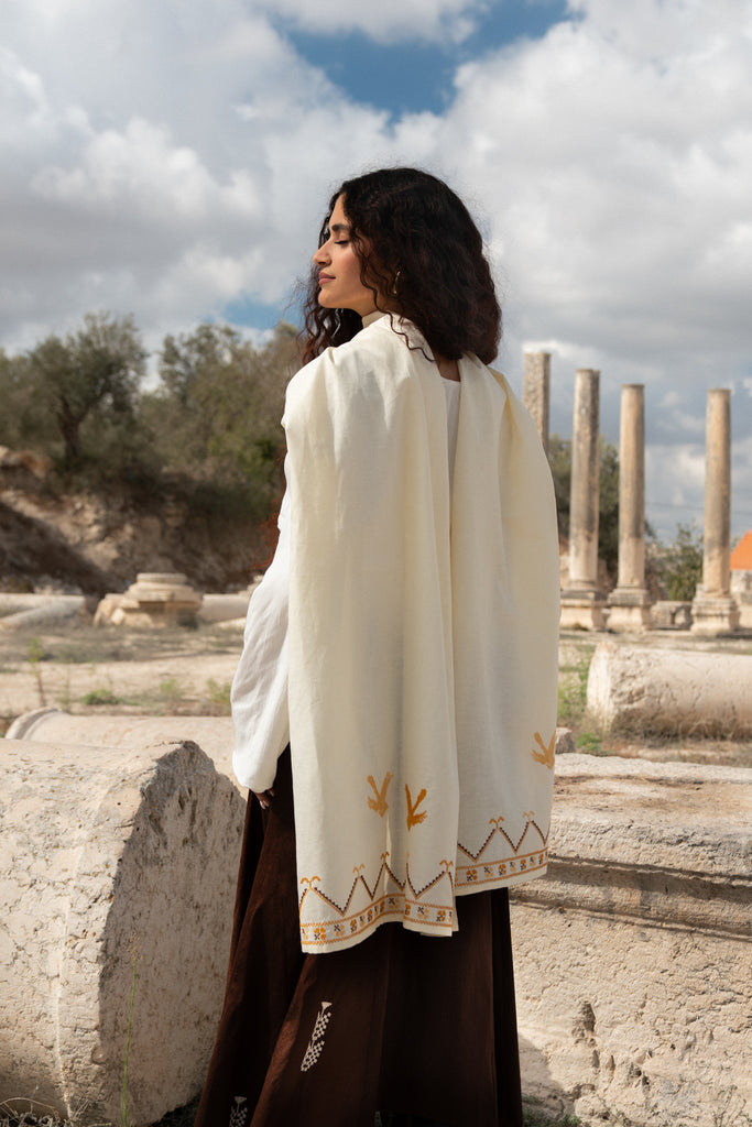 The Nadia is made with a linen in soft yellow and features hand-embroidery. Cut, sewn, and had-embroidered by Um Mousa and her team in Bethlehem.
