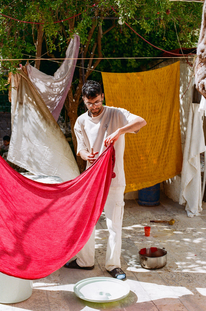 Palestine, like indigenous communities all over the world, has a historically strong, reverent, and harmonious relationship with the land. in the last several decades, practices like the use of natural fibers, natural dyeing, and slow labor have been threatened in the face of an increasingly industrialized and commercialized world. Furthermore, these practices are threatened with erasure by appropriation and violence under military occupation. By slowly incorporating ancestral practices like natural dyeing and partnering with cooperatives which hand-weave or hand-embroider, and sourcing natural and dead-stock fabrics, we hope to spark a more conscious conversation about the intersectional impact of fashion on the environment, politics, and identity.