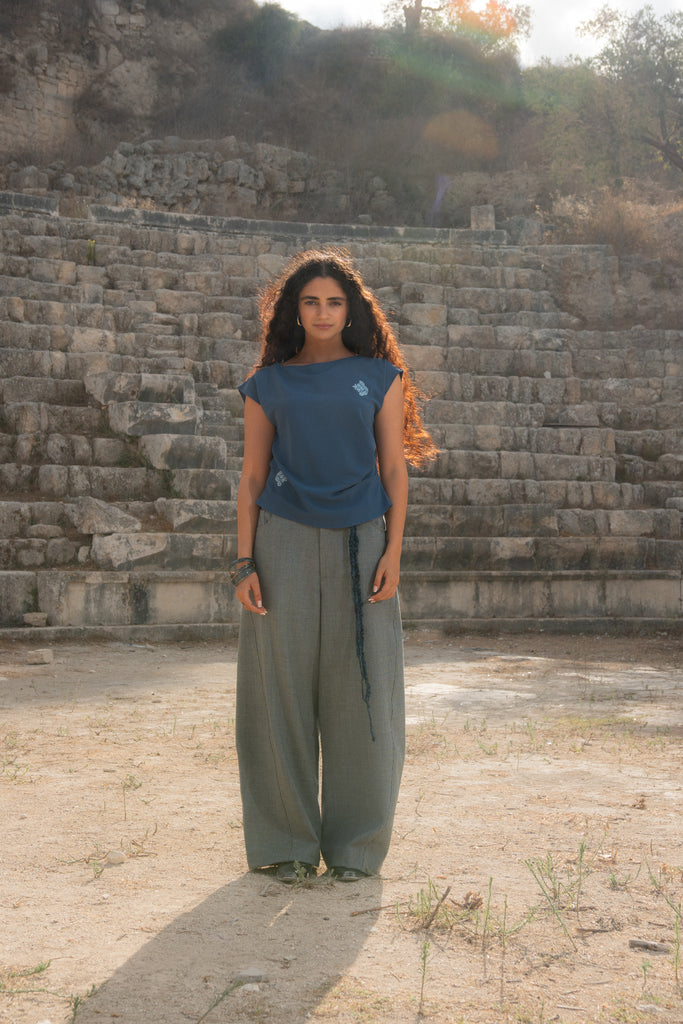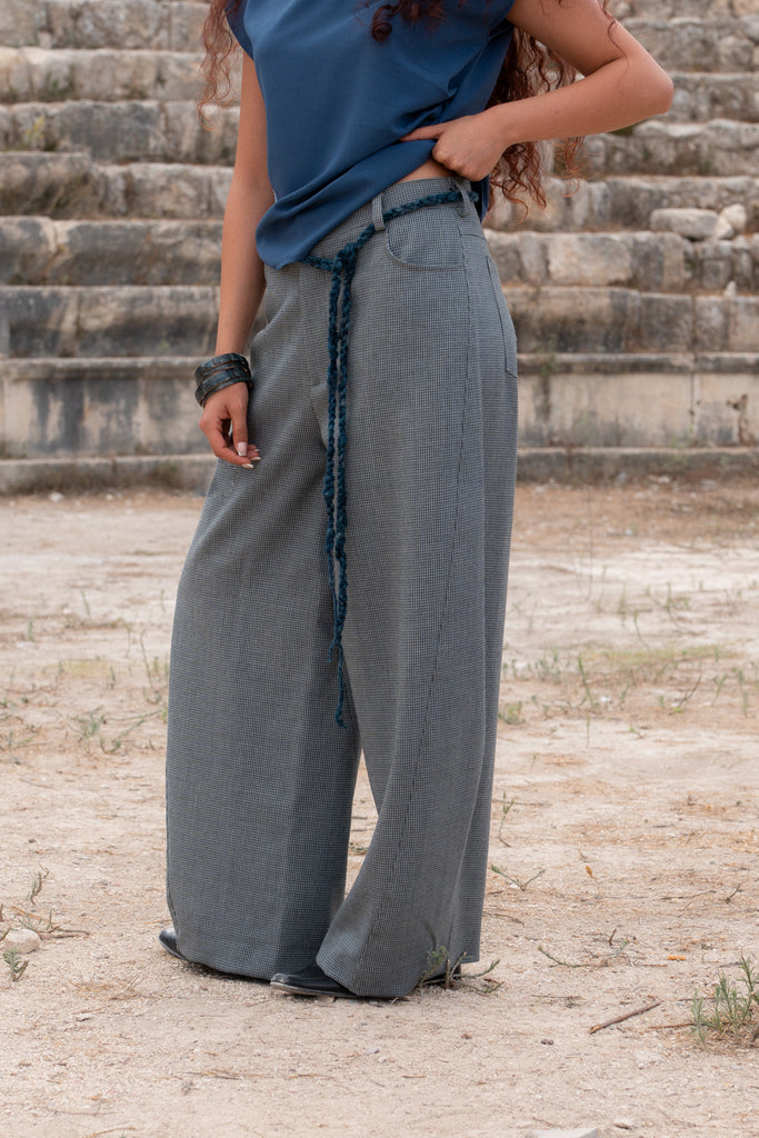 The Nihal trousers are designed in a relaxed barrel style, featuring hand-spun wool tassels that add texture and movement.