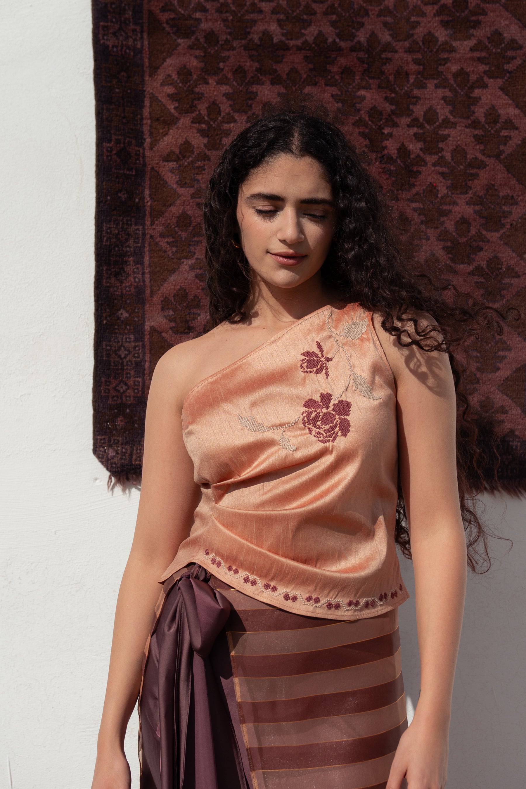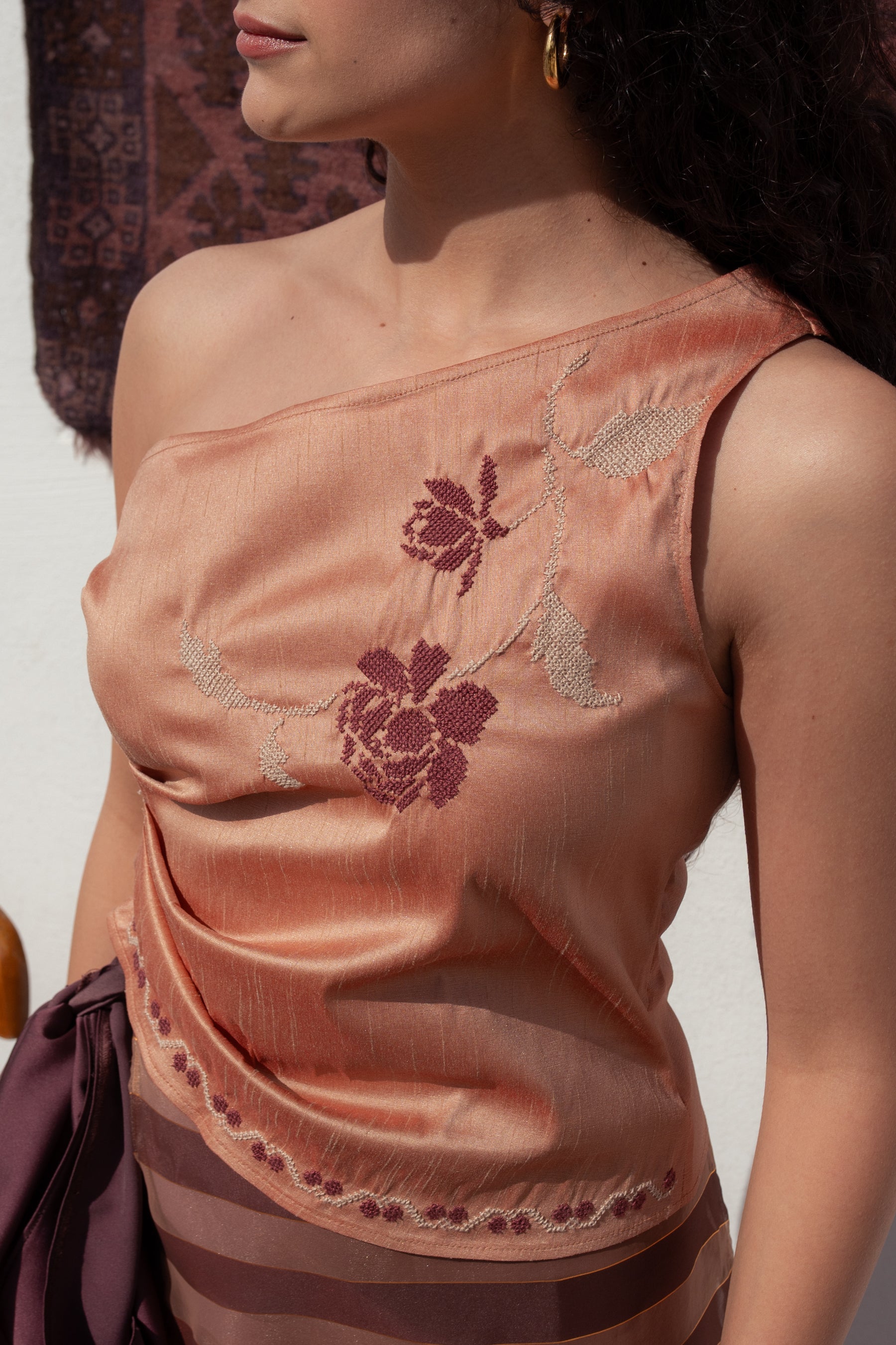 the Talia is made in a shimmery silk fabric in a watermelon hue and then hand-embroidered with a rose motif