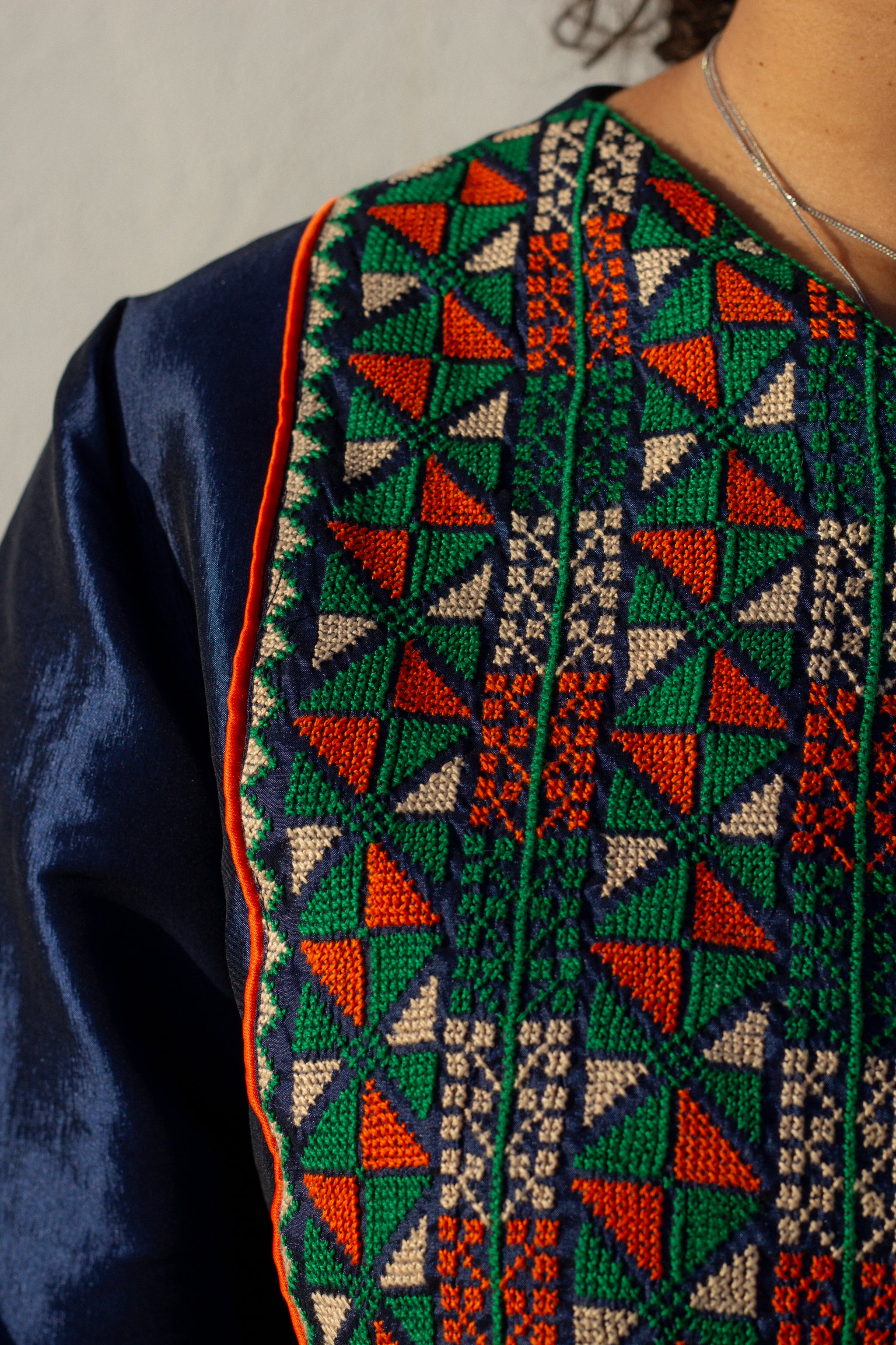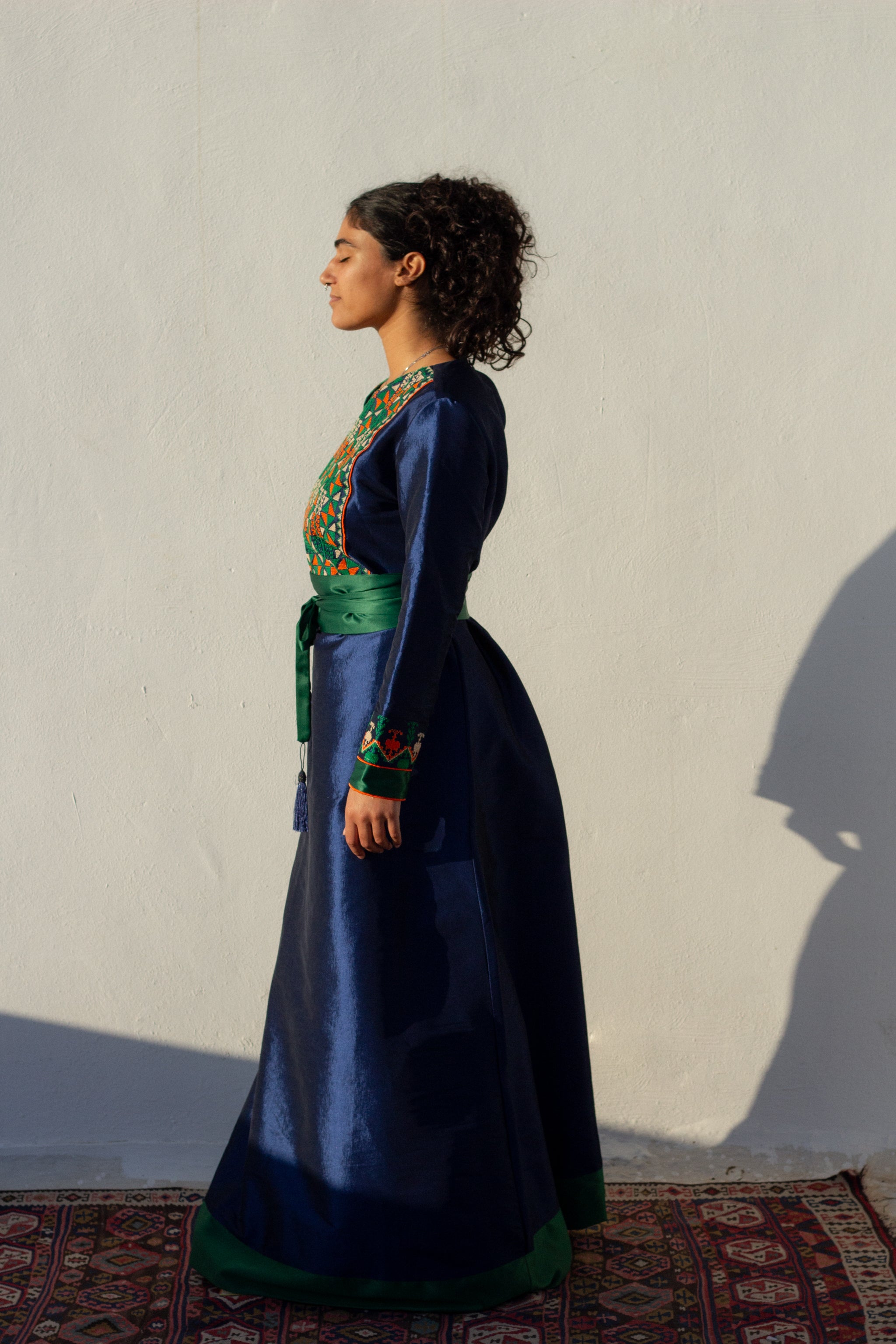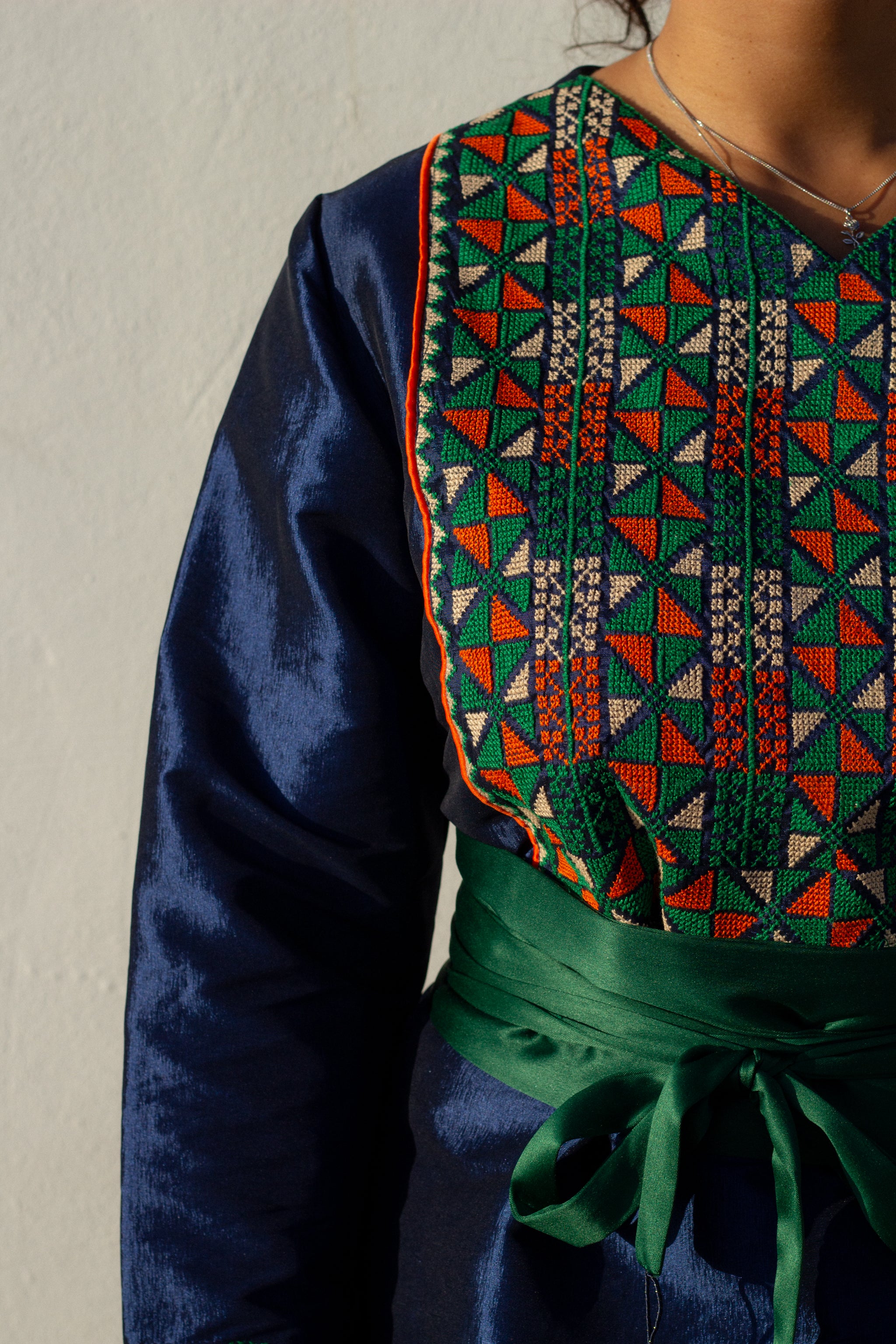 a traditional Palestinian thob (traditional dress) featuring hand-emboridered tatreez on silk taffeta fabric. embroidered over 4 months.