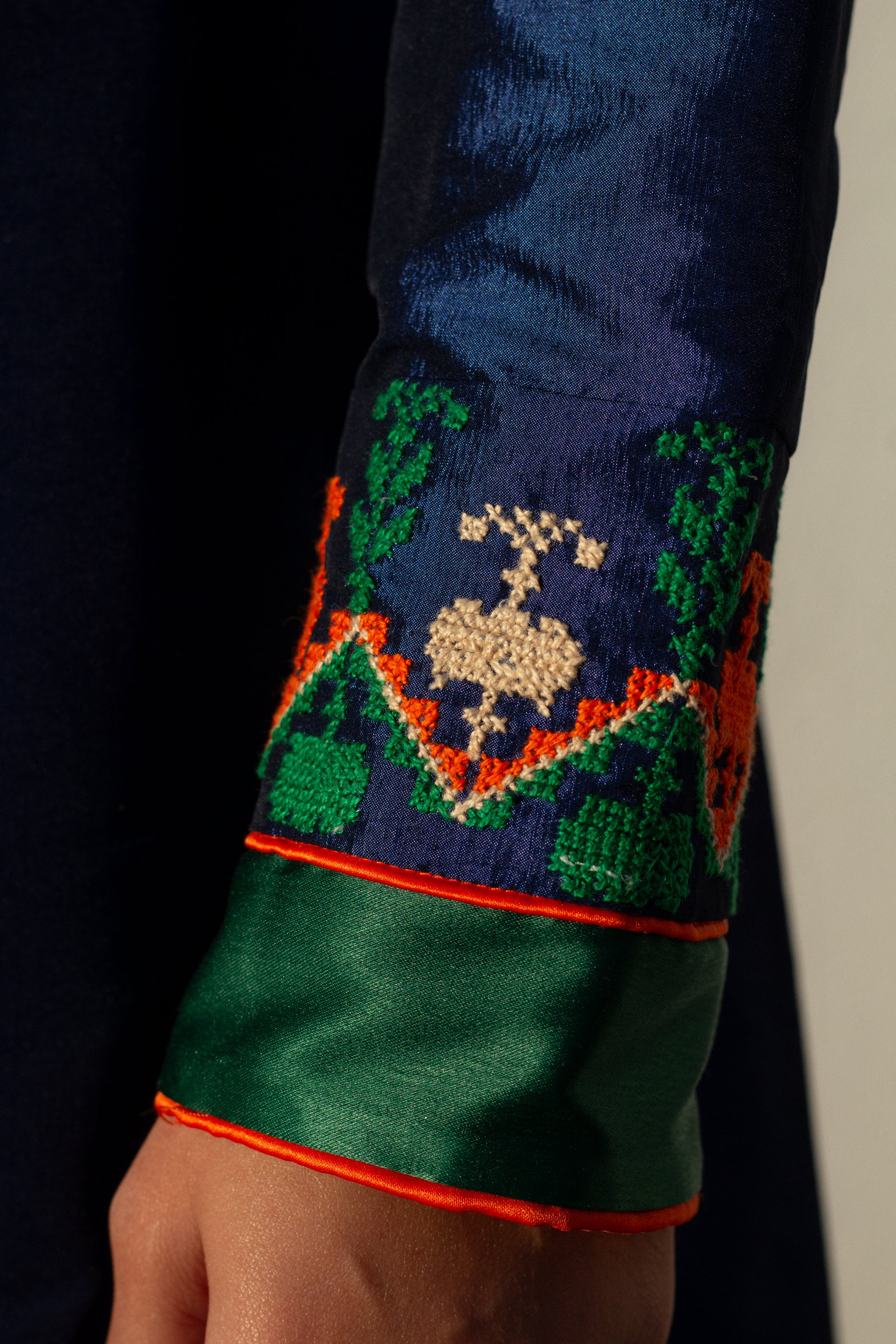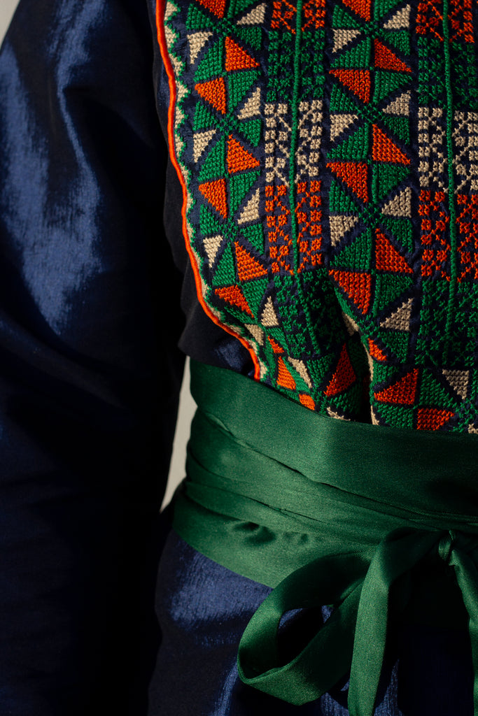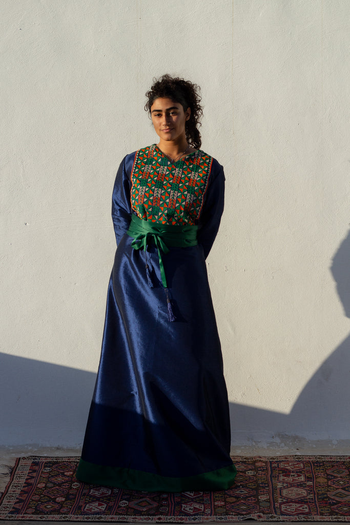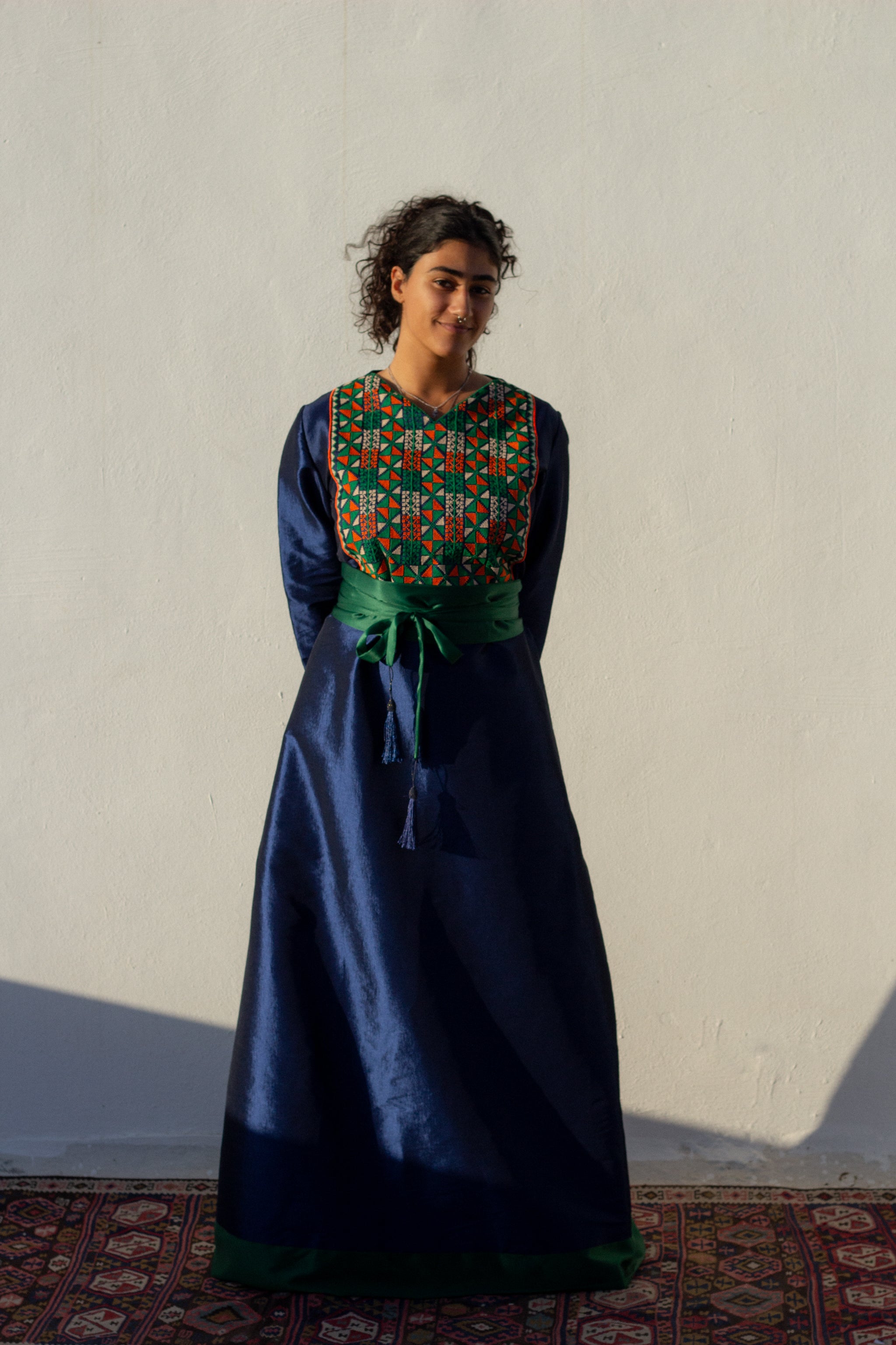 a traditional Palestinian thob (traditional dress) featuring hand-emboridered tatreez on silk taffeta fabric. embroidered over 4 months.